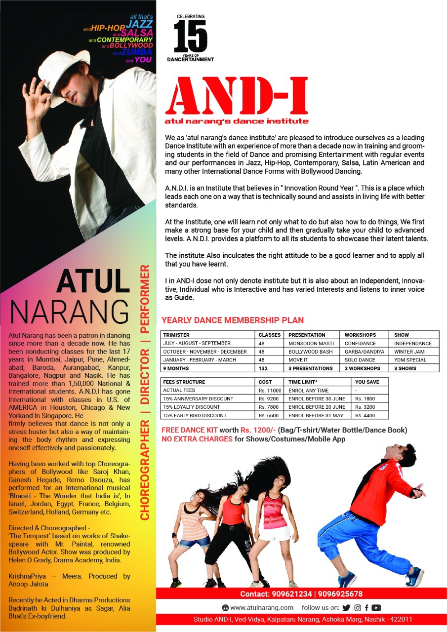 *ANDI* invites You to be Yearly Dance Member Starting July 2018 *SAVE Rs. 4400/-* *YDM* 9 *Months* Course. 4 *Days* a week. 132 *Classes.* 3 *Shows* 3 *Presentations* Exclusive *Dance Kit* - Bag | T-shirt | Water bottle | Dance book. ANDI *mobile App* to stay connected with the class *24/7* with *free* *tutorials* for missed classes and check *progress.* *Youtube* appearance. Enroll Your child for the most Enriching Course by Atul Narangs Dance I*Education* *Curriculum* Based for different Age Group 3-6 | 7-12 | 13 above *SAVE* Rs. 4400/- Plus Get All the other benefits *FREE* Regards TEAM AND-I www.atulnarang.com Follow us on - facebook https://www.facebook.com/andiworldwide/ Youtube- https://www.youtube.com/user/TheYoudancetube Call2dance Between 10am to 8pm 9096921234 9096925678 0253 6636112
