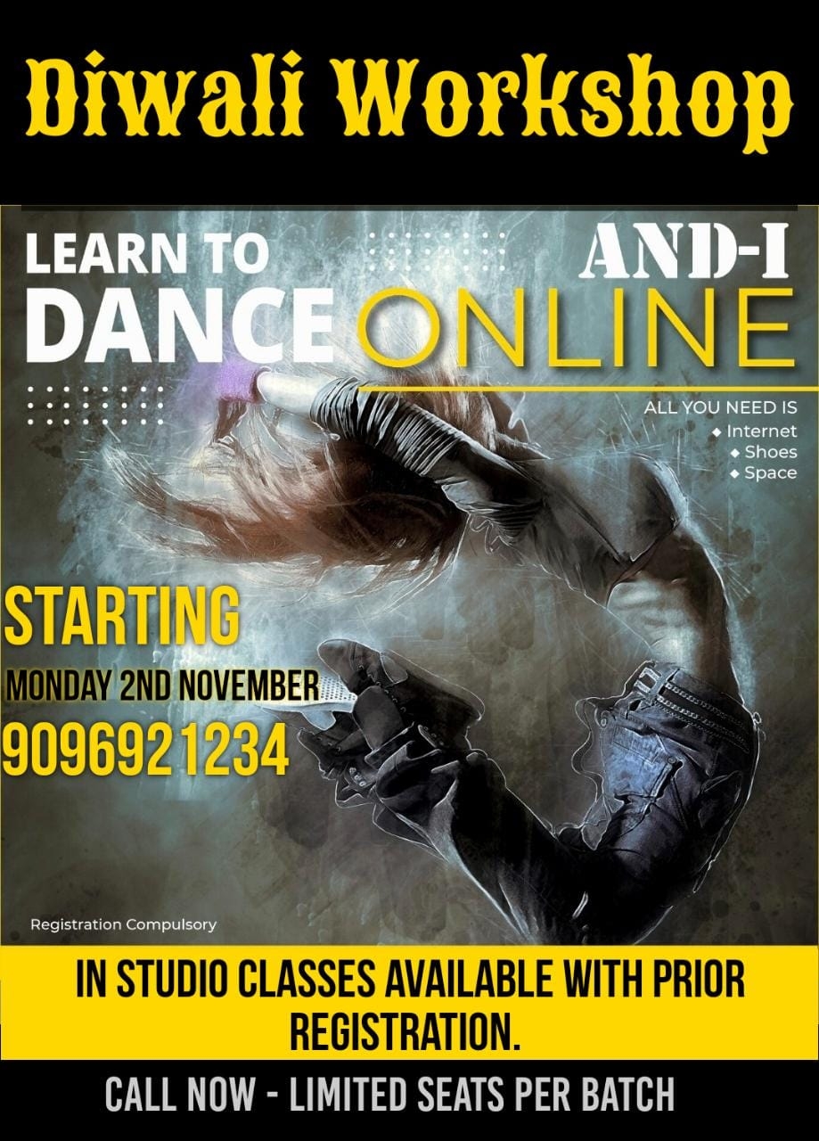 Dance this Diwali Workshop Starts : 2nd November 2020 Duration: 10+2 Days Fees: Rs. 1000/- Learn 2 choreographies and Absolutely new form of western dance. Online Dance Classes as well as Studio Classes Available with prior Registration only. For more details call 9096921234 Video profile After the workshop we will video record your performance . Timings Teens 12 above - 4 pm Toddlers 3-6 years - 5 pm Juniors 6-12 years - 6 pm Seniors - 7 pm Salsa - 8 pm