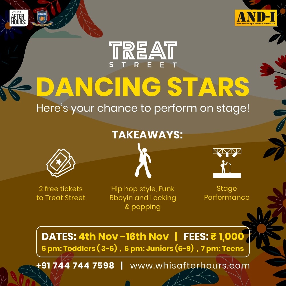Hello Wisdom high international school After hours and Atul Narangs Dance Institute brings to you Dancing Stars. Dance workshop focusing on street styles Funk hip hop locking popping on your favourite Bollywood songs. Get a chance to perform at the biggest family event