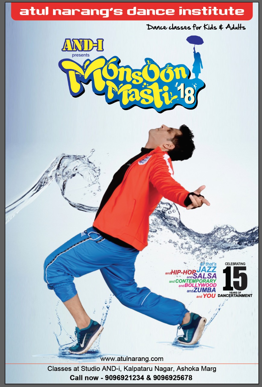 MONSOON MASTI’18 3 months dance course from July till September. 48 sessions, Dance Presentation and A Grand Show Classes will be held from Monday to Thursday Timings: Toddler (3-6) 5:30 pm / Juniors (7 to 12) 6:30 pm / Teens and Seniors (13 above) 7:30 pm atul narangs dance institute celebrating 15 years of dancertainment. Studio AND-I dance and fitness classes for kids and adults.