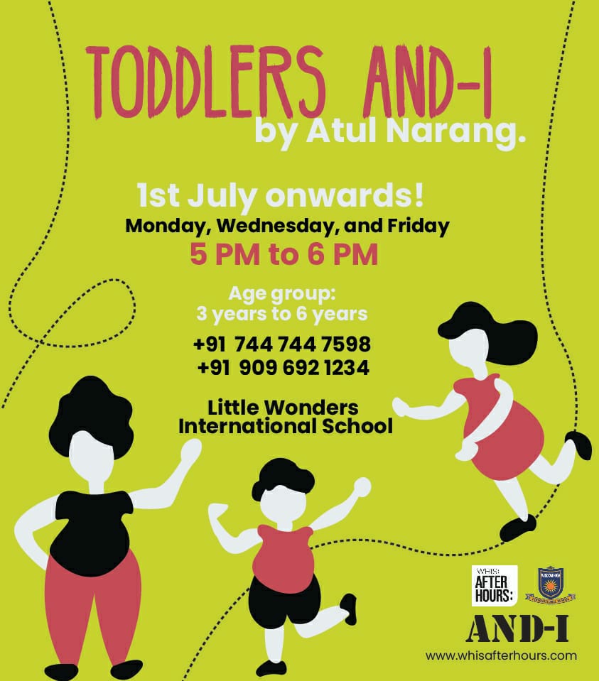 Toddlers AND-I Age Group: 3-6 years It has been proven that the best Years of Learning starts from the age of 2 years, Atul Narang has designed a special curriculum for the babies – toddlers. Method of teaching is interactive and communicative. Techniques in dance are taught via lyrical rhymes which make it easy to remember and fun to learn. Toddlers understand the idea of body language, body flexibility and ofcourse dance which will increase their skill of concentration and focus. Each Class is full of energetic rhythm and dances. kids move to the fun beat of pop and hip hop music. they will learn simple jazz moves, jumps and turns. this class uses peppy bollywood music. Fees: 1200 Time: 5 to 6 pm Days: Mon Wed Fri
